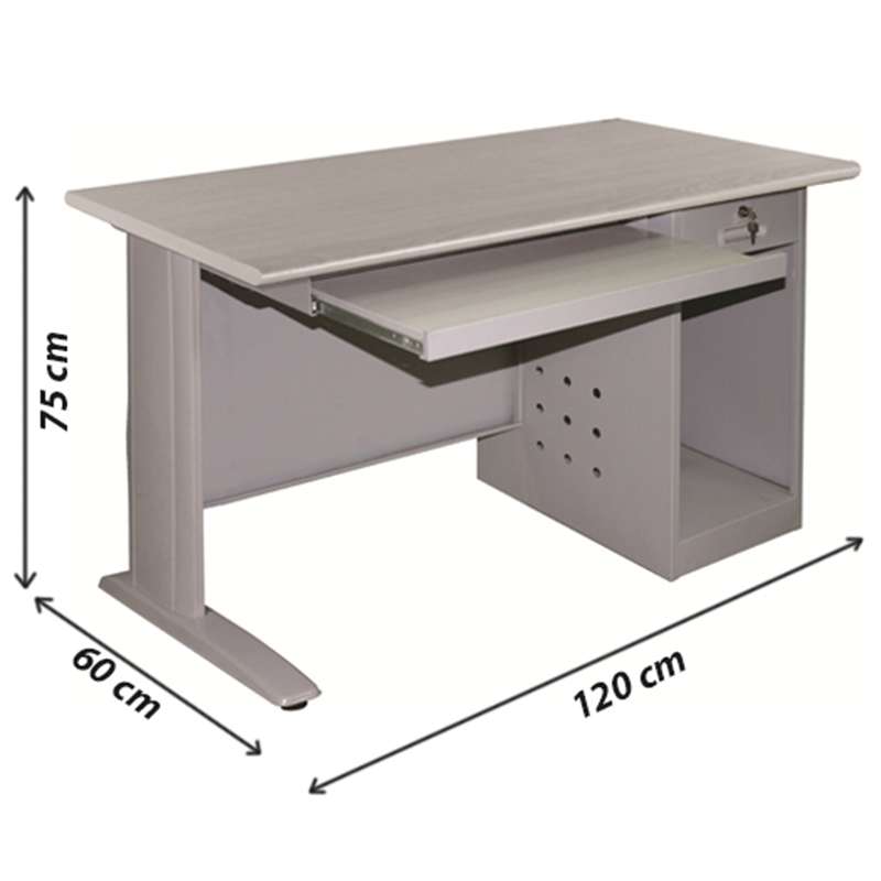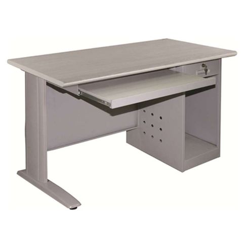 Bàn làm việc mặt gỗ Laminate, chân thép sơn tĩnh điện. Bàn có 1 hộc cố định dùng để case máy tính và 1 bàn phím ray bi