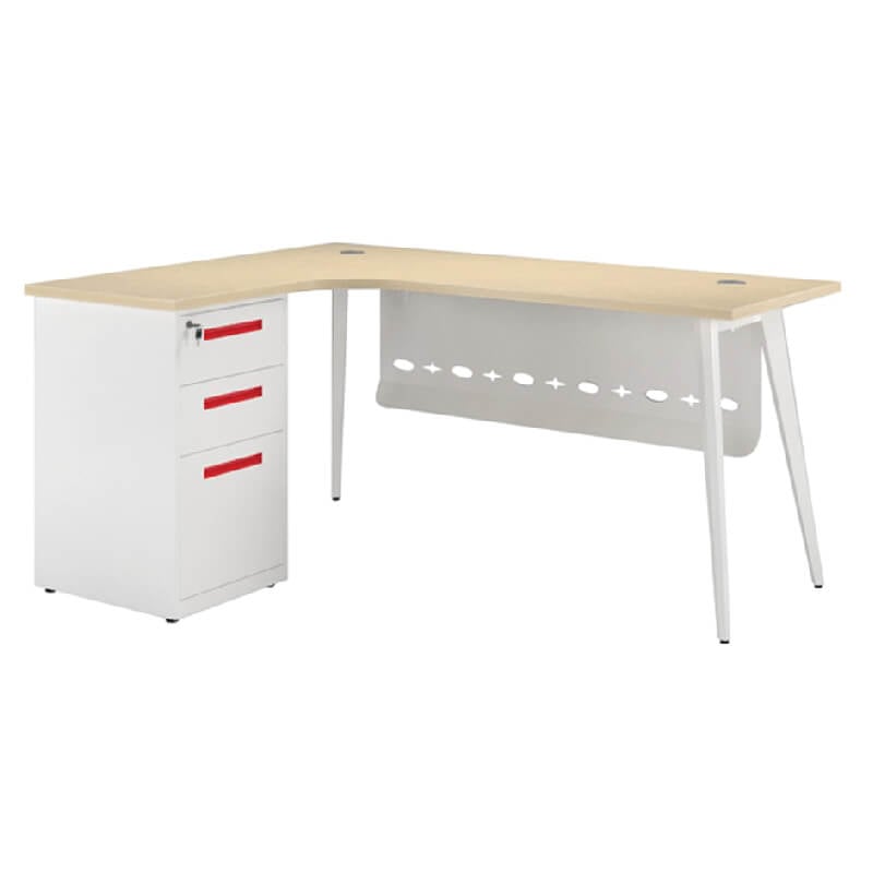 Bàn làm việc sử dụng khung thép C10 dập định hình sơn tĩnh điện. Mặt bàn gỗ Melamine cao cấp. Bàn có hộc liền bằng thép sơn tĩnh điện màu trắng ngọc trai với 3 ngăn kéo sử dụng khóa dàn và yếm tôn đột lỗ trang trí