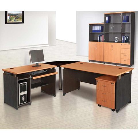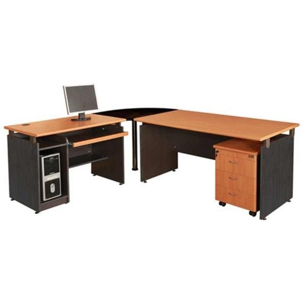 Bàn lãnh đạo mặt bàn Laminate gồm: Bàn làm việc, bàn phụ, hộc, góc nối có chân ML720.
