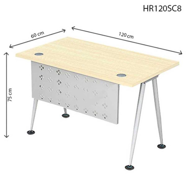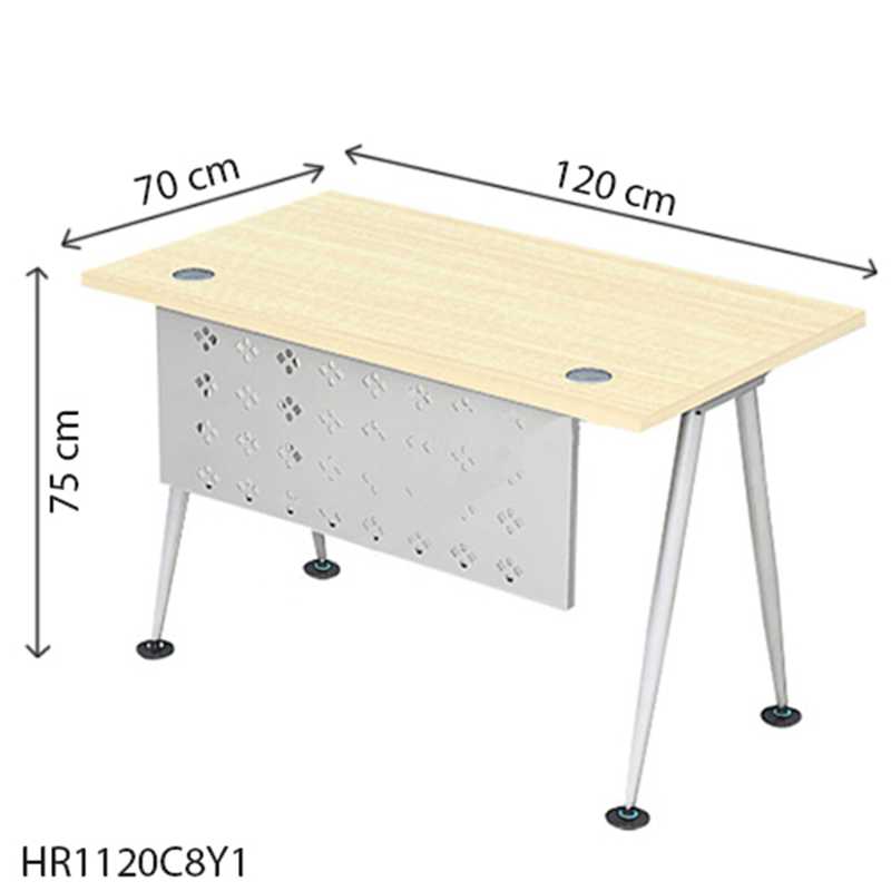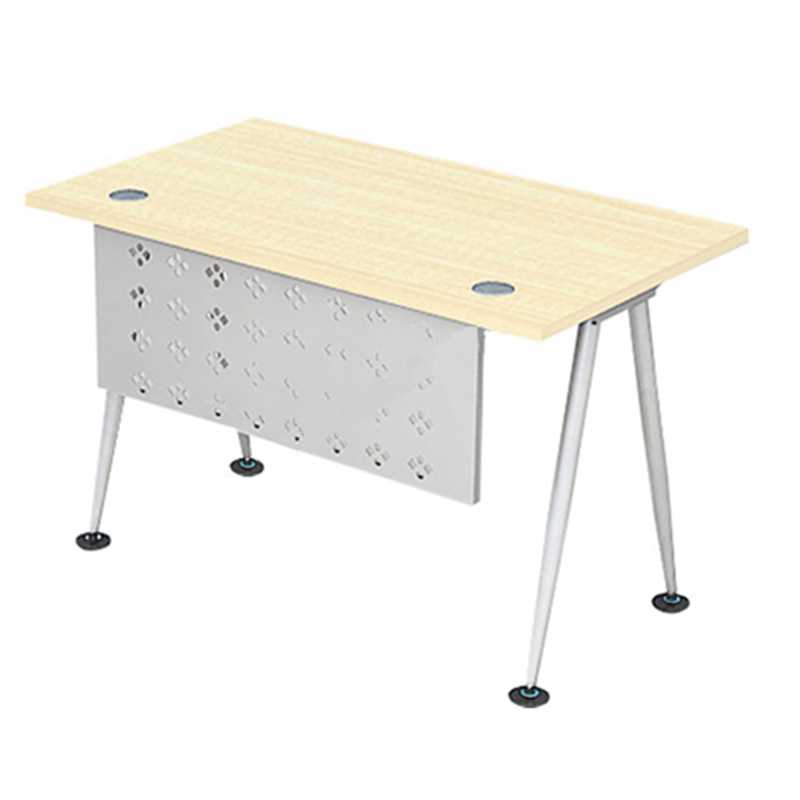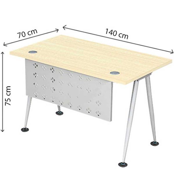 Bàn làm việc chân thép được tóp một đầu, mặt gỗ Melamine. Bàn có yếm tôn đột lỗ trang trí.
