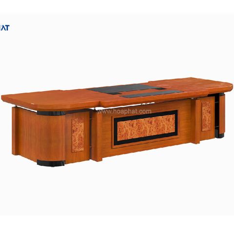 Bàn lãnh đạo cao cấp mặt bàn lượn cong, yếm ốp nổi. Tủ tài liệu có 4 khoang cánh dài, 2 khoang cánh ngắn, khoang giữa không cánh. Mặt ngoài Veneer mặt trong dùng Melamine