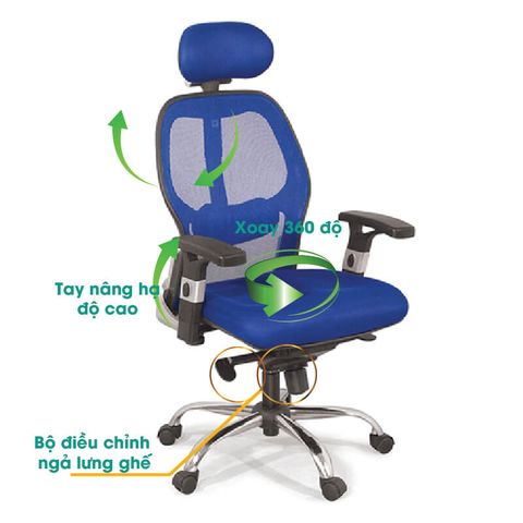 Ghế lưới cao cấp có tựa đầu, khung nhựa đúc kết hợp đế thép bọc vải lưới. Ghế có cơ cấu ngả lưng đa chiều. Chân Sắt Mạ. Tay ghế điều chỉnh độ cao thấp. Hỗ trợ cột sống lưng, phòng chống mỏi tay và chống mỏi đầu vai gáy