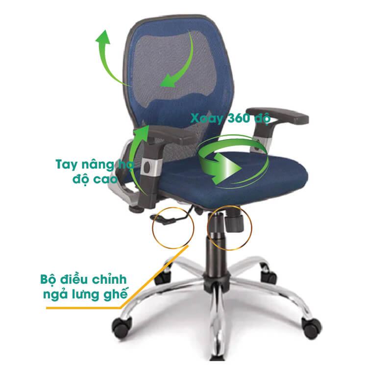 Ghế lưới cao cấp, khung nhựa đúc kết hợp đế thép bọc vải lưới. Ghế có cơ cấu ngả lưng đa chiều bằng mún vặn. Tay ghế điều chỉnh độ cao thấp. Hỗ trợ cột sống lưng, phòng chống mỏi tay và chống mỏi đầu vai gáy