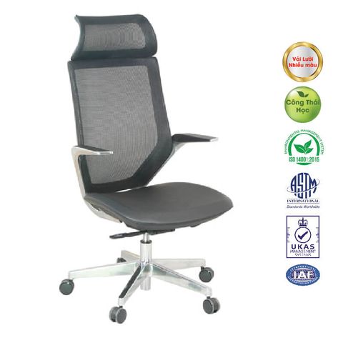 Ghế Công Thái Học cao cấp. Khung ghế bằng hợp kim nhôm kết hợp với nhựa nguyên chất. Ghế xoay VIP lưng bọc Vải Lưới, tay chân hợp kim nhôm. Bánh xe nhựa PU D60. Ghế có cơ cấu ngả lưng đa chiều, hãm ở nhiều góc độ. Chân Tay hợp kim nhôm.