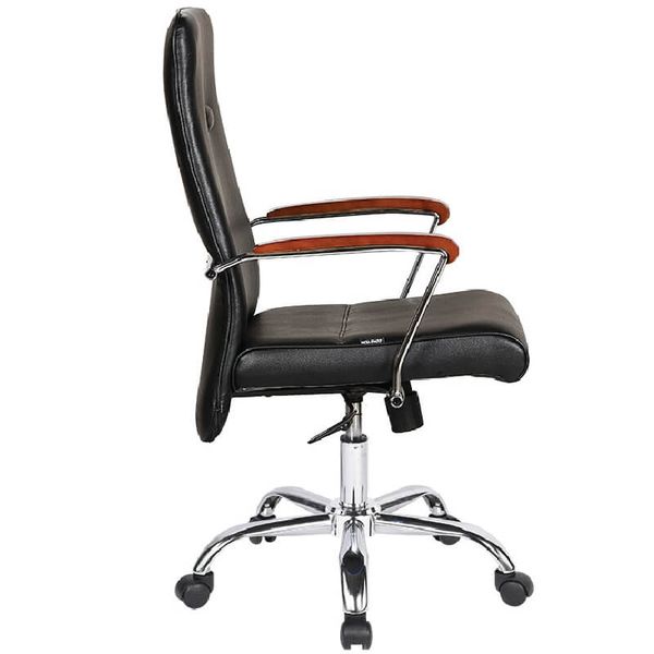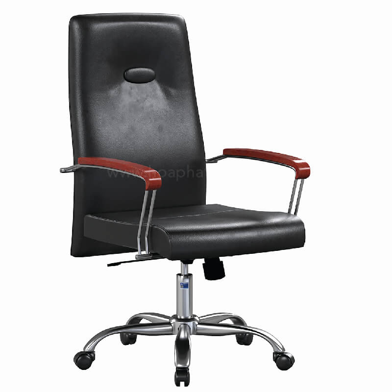Chất liệu: Đêm tựa ghế là cốt gỗ tự nhiên ép định hình, bọc PVC, Tay ghế thép mạ NikenCrome được ốp gỗ tự nhiên, Chân 5 sao bằng thép mạ có bán xe di chuyển