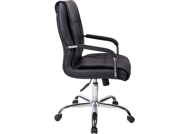 Chất liệu: Đêm tựa ghế là cốt gỗ bọc da, Tay ghế bằng thép mạ Niken Crome ốp nhựa, Chân 5 sao bằng thép mạ có bán xe di chuyển