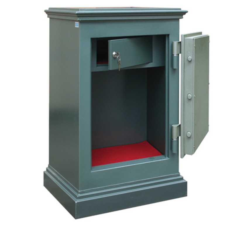 Dòng két đứng có khóa chìa, khóa điện tử, tay nắm tròn. Két có 1 cánh mở, 2 bản lề nổi. Lòng két có 1 ngăn phụ
