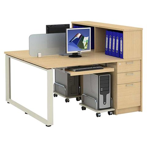 Modul làm việc 2 chỗ có hộc liền, khung thép tam giác, mặt gỗ Melamine. Mặt bàn có vách ngăn và kệ để tài liệu.