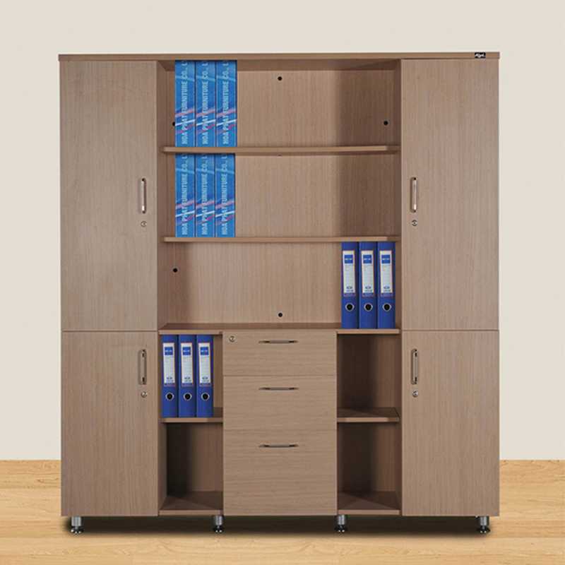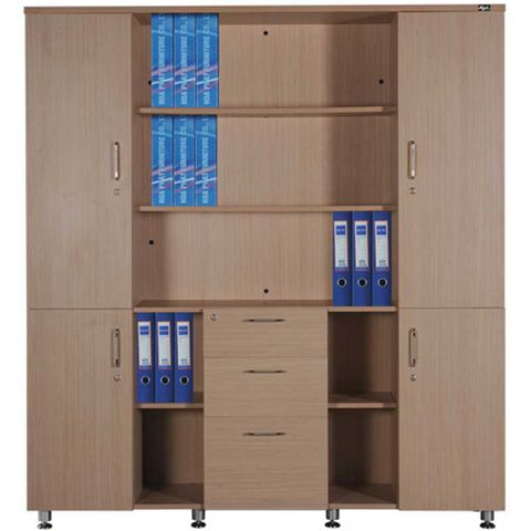 Tủ tài liệu 4 buồng, phía trên là 2 khoang cánh mở và 2 khoang để tài liệu, phía dưới có 3 ngăn kéo và hai cánh mở