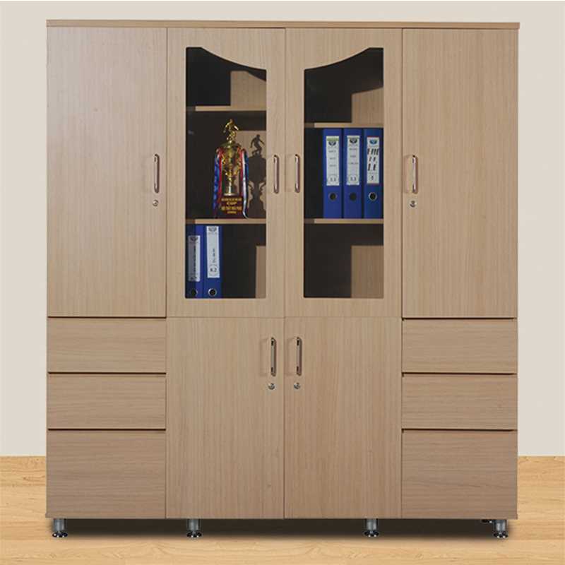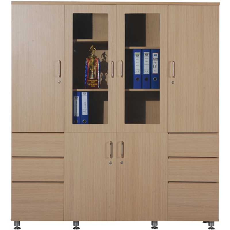 Tủ tài liệu 4 buồng, phía trên là 2 khoang cánh kính để tài liệu và 2 khoang cánh mở, phía dưới có 6 ngăn kéo và hai cánh mở