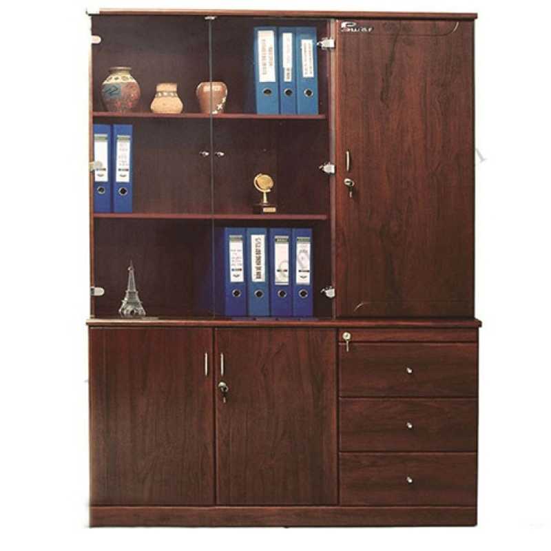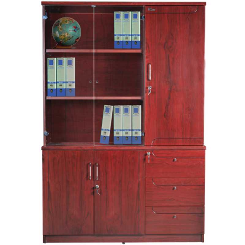 Tủ tài liệu 3 buồng, phía trên là 2 khoang cánh kính để tài liệu và 1 khoang treo áo, phía dưới có 3 ngăn kéo và hai cánh mở