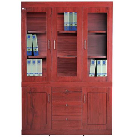 Tủ tài liệu 3 buồng, phía trên gồm 3 khoang khung cánh kính để tài liệu, phía dưới 3 ngăn kéo và hai cánh mở