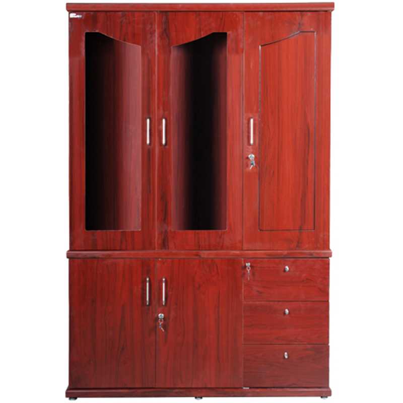 Tủ tài liệu 3 buồng, phía trên gồm 2 khoang khung cánh kính để tài liệu và 1 khoang treo áo, phía dưới 3 ngăn kéo và hai cánh mở
