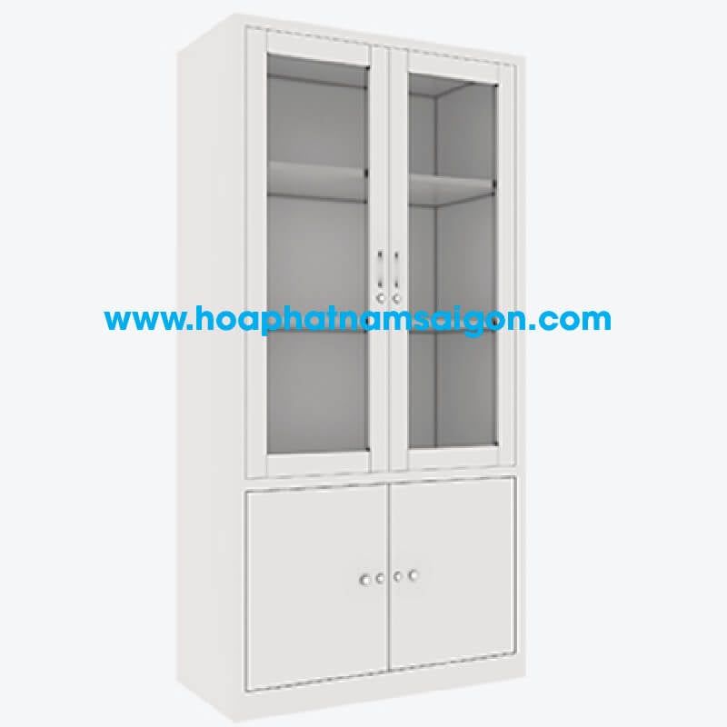 Tủ sắt sơn tĩnh điện 2 khoang: Khoang trên có 2 đợt di động và khung cánh kính mở. Khoang dưới có 2 cánh sắt mở