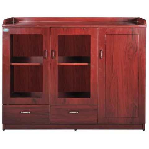 Tủ thấp 3 buồng, trong đó có 2 buồng phía trên là khoang cánh kính, phía dưới là ngăn kéo, buồng còn lại cánh mở